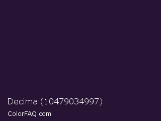 Decimal 10479034997 Color is a very dark purple color and the nearest color is Revolver #2c1632. Hex code #271333 and RGB value is rgb(39,19,51). In RGB color space, this color is composed of 15% red, 7% green, 20% blue, In CMYK color space, this color is composed of 24% cyan, 63% magenta, 0% yellow , 80% black , In HSL color space, this color has a hue angle of 278° , 46% saturation and 14% lightness.