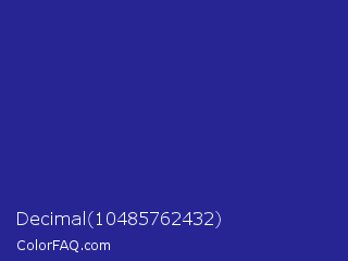 Decimal 10485762432 Color is a normal indigo color and the nearest color is Jacksons Purple #20208d. Hex code #272594 and RGB value is rgb(39,37,148). In RGB color space, this color is composed of 15% red, 15% green, 58% blue, In CMYK color space, this color is composed of 74% cyan, 75% magenta, 0% yellow , 42% black , In HSL color space, this color has a hue angle of 241° , 60% saturation and 36% lightness.