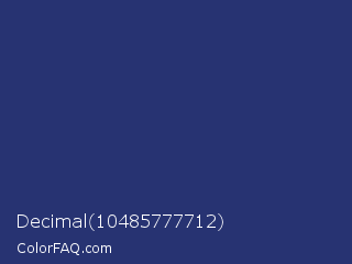 Decimal 10485777712 Color is a dark blue color and the nearest color is Astronaut #283a77. Hex code #273372 and RGB value is rgb(39,51,114). In RGB color space, this color is composed of 15% red, 20% green, 45% blue, In CMYK color space, this color is composed of 66% cyan, 55% magenta, 0% yellow , 55% black , In HSL color space, this color has a hue angle of 230° , 49% saturation and 30% lightness.