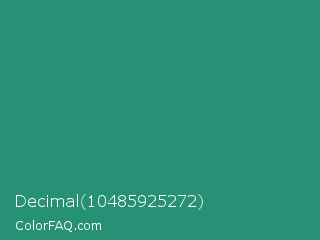 Decimal 10485925272 Color is a normal cyan color and the nearest color is Illuminating Emerald #319177. Hex code #279176 and RGB value is rgb(39,145,118). In RGB color space, this color is composed of 15% red, 57% green, 46% blue, In CMYK color space, this color is composed of 73% cyan, 0% magenta, 19% yellow , 43% black , In HSL color space, this color has a hue angle of 165° , 58% saturation and 36% lightness.