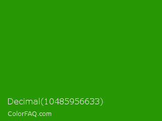 Decimal 10485956633 Color is a dark green color and the nearest color is Slimy Green #299617. Hex code #279703 and RGB value is rgb(39,151,3). In RGB color space, this color is composed of 15% red, 59% green, 1% blue, In CMYK color space, this color is composed of 74% cyan, 0% magenta, 98% yellow , 41% black , In HSL color space, this color has a hue angle of 105° , 96% saturation and 30% lightness.