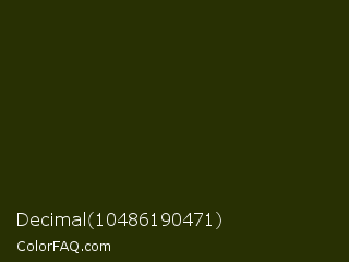 Decimal 10486190471 Color is a very dark lime color and the nearest color is Turtle Green #2a380b. Hex code #283003 and RGB value is rgb(40,48,3). In RGB color space, this color is composed of 16% red, 19% green, 1% blue, In CMYK color space, this color is composed of 17% cyan, 0% magenta, 94% yellow , 81% black , In HSL color space, this color has a hue angle of 71° , 88% saturation and 10% lightness.
