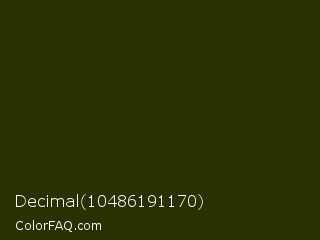 Decimal 10486191170 Color is a very dark lime color and the nearest color is Turtle Green #2a380b. Hex code #283102 and RGB value is rgb(40,49,2). In RGB color space, this color is composed of 16% red, 19% green, 1% blue, In CMYK color space, this color is composed of 18% cyan, 0% magenta, 96% yellow , 81% black , In HSL color space, this color has a hue angle of 71° , 92% saturation and 10% lightness.