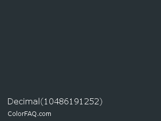Decimal 10486191252 Color is a very dark blue color and the nearest color is Gunmetal #2a3439. Hex code #283136 and RGB value is rgb(40,49,54). In RGB color space, this color is composed of 16% red, 19% green, 21% blue, In CMYK color space, this color is composed of 26% cyan, 9% magenta, 0% yellow , 79% black , In HSL color space, this color has a hue angle of 201° , 15% saturation and 18% lightness.