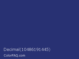 Decimal 10486191445 Color is a dark blue color and the nearest color is Astronaut #283a77. Hex code #283173 and RGB value is rgb(40,49,115). In RGB color space, this color is composed of 16% red, 19% green, 45% blue, In CMYK color space, this color is composed of 65% cyan, 57% magenta, 0% yellow , 55% black , In HSL color space, this color has a hue angle of 233° , 48% saturation and 30% lightness.