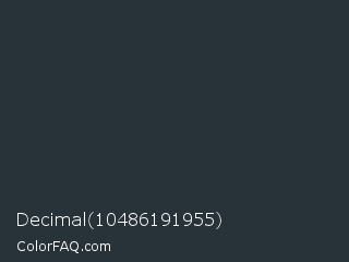 Decimal 10486191955 Color is a very dark blue color and the nearest color is Gunmetal #2a3439. Hex code #283239 and RGB value is rgb(40,50,57). In RGB color space, this color is composed of 16% red, 20% green, 22% blue, In CMYK color space, this color is composed of 30% cyan, 12% magenta, 0% yellow , 78% black , In HSL color space, this color has a hue angle of 205° , 18% saturation and 19% lightness.