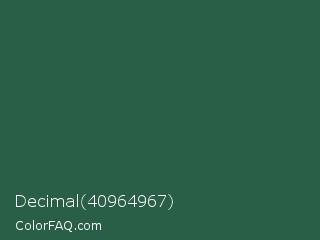 Decimal 40964967 Color is a dark green color and the nearest color is Green Pea #1d6142. Hex code #295f47 and RGB value is rgb(41,95,71). In RGB color space, this color is composed of 16% red, 37% green, 28% blue, In CMYK color space, this color is composed of 57% cyan, 0% magenta, 25% yellow , 63% black , In HSL color space, this color has a hue angle of 153° , 40% saturation and 27% lightness.