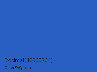 Decimal 40965264 Color is a normal blue color and the nearest color is Cerulean Blue #2a52be. Hex code #295fc2 and RGB value is rgb(41,95,194). In RGB color space, this color is composed of 16% red, 37% green, 76% blue, In CMYK color space, this color is composed of 79% cyan, 51% magenta, 0% yellow , 24% black , In HSL color space, this color has a hue angle of 219° , 65% saturation and 46% lightness.