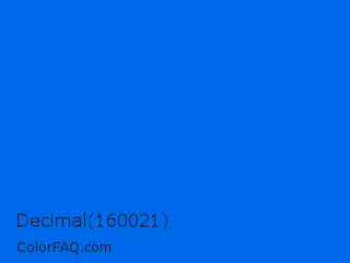 Decimal 160021 Color is a normal blue color and the nearest color is Blue Ribbon #0066ff. Hex code #0069eb and RGB value is rgb(0,105,235). In RGB color space, this color is composed of 0% red, 41% green, 92% blue, In CMYK color space, this color is composed of 100% cyan, 55% magenta, 0% yellow , 8% black , In HSL color space, this color has a hue angle of 213° , 100% saturation and 46% lightness.