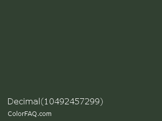Decimal 10492457299 Color is a very dark green color and the nearest color is Kombu Green #354230. Hex code #314031 and RGB value is rgb(49,64,49). In RGB color space, this color is composed of 19% red, 25% green, 19% blue, In CMYK color space, this color is composed of 23% cyan, 0% magenta, 23% yellow , 75% black , In HSL color space, this color has a hue angle of 120° , 13% saturation and 22% lightness.