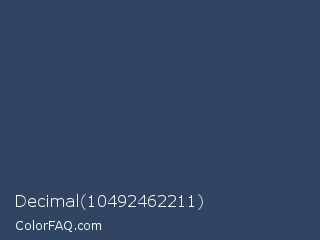 Decimal 10492462211 Color is a dark blue color and the nearest color is Rhino #2e3f62. Hex code #314563 and RGB value is rgb(49,69,99). In RGB color space, this color is composed of 19% red, 27% green, 39% blue, In CMYK color space, this color is composed of 51% cyan, 30% magenta, 0% yellow , 61% black , In HSL color space, this color has a hue angle of 216° , 34% saturation and 29% lightness.