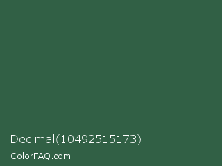 Decimal 10492515173 Color is a dark green color and the nearest color is Hunter Green #355e3b. Hex code #316045 and RGB value is rgb(49,96,69). In RGB color space, this color is composed of 19% red, 38% green, 27% blue, In CMYK color space, this color is composed of 49% cyan, 0% magenta, 28% yellow , 62% black , In HSL color space, this color has a hue angle of 146° , 32% saturation and 28% lightness.