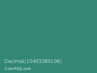 Decimal 10493389108 Color is a normal cyan color and the nearest color is Celadon Green #2f847c. Hex code #328776 and RGB value is rgb(50,135,118). In RGB color space, this color is composed of 20% red, 53% green, 46% blue, In CMYK color space, this color is composed of 63% cyan, 0% magenta, 13% yellow , 47% black , In HSL color space, this color has a hue angle of 168° , 46% saturation and 36% lightness.