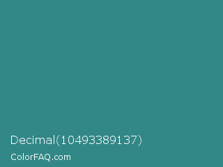 Decimal 10493389137 Color is a normal cyan color and the nearest color is Lochinvar #2c8c84. Hex code #328787 and RGB value is rgb(50,135,135). In RGB color space, this color is composed of 20% red, 53% green, 53% blue, In CMYK color space, this color is composed of 63% cyan, 0% magenta, 0% yellow , 47% black , In HSL color space, this color has a hue angle of 180° , 46% saturation and 36% lightness.