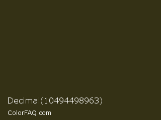 Decimal 10494498963 Color is a very dark yellow color and the nearest color is Woodrush #302a0f. Hex code #343115 and RGB value is rgb(52,49,21). In RGB color space, this color is composed of 20% red, 19% green, 8% blue, In CMYK color space, this color is composed of 0% cyan, 6% magenta, 60% yellow , 80% black , In HSL color space, this color has a hue angle of 54° , 42% saturation and 14% lightness.
