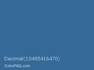 Decimal 10495416470 Color is a normal blue color and the nearest color is Queen Blue #436b95. Hex code #356998 and RGB value is rgb(53,105,152). In RGB color space, this color is composed of 21% red, 41% green, 60% blue, In CMYK color space, this color is composed of 65% cyan, 31% magenta, 0% yellow , 40% black , In HSL color space, this color has a hue angle of 208° , 48% saturation and 40% lightness.