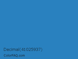 Decimal 41025937 Color is a normal blue color and the nearest color is Cyan Cornflower Blue #188bc2. Hex code #2981bf and RGB value is rgb(41,129,191). In RGB color space, this color is composed of 16% red, 51% green, 75% blue, In CMYK color space, this color is composed of 79% cyan, 32% magenta, 0% yellow , 25% black , In HSL color space, this color has a hue angle of 205° , 65% saturation and 45% lightness.