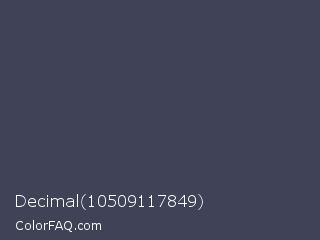 Decimal 10509117849 Color is a dark blue color and the nearest color is Gun Powder #414257. Hex code #404357 and RGB value is rgb(64,67,87). In RGB color space, this color is composed of 25% red, 26% green, 34% blue, In CMYK color space, this color is composed of 26% cyan, 23% magenta, 0% yellow , 66% black , In HSL color space, this color has a hue angle of 232° , 15% saturation and 30% lightness.