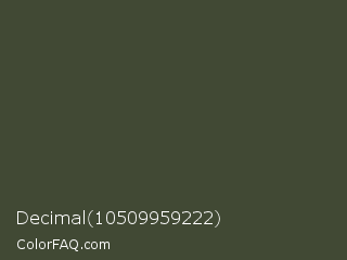 Decimal 10509959222 Color is a dark green color and the nearest color is Kelp #454936. Hex code #414934 and RGB value is rgb(65,73,52). In RGB color space, this color is composed of 25% red, 29% green, 20% blue, In CMYK color space, this color is composed of 11% cyan, 0% magenta, 29% yellow , 71% black , In HSL color space, this color has a hue angle of 83° , 17% saturation and 25% lightness.
