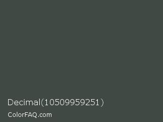 Decimal 10509959251 Color is a dark green color and the nearest color is Outer Space #414a4c. Hex code #414945 and RGB value is rgb(65,73,69). In RGB color space, this color is composed of 25% red, 29% green, 27% blue, In CMYK color space, this color is composed of 11% cyan, 0% magenta, 5% yellow , 71% black , In HSL color space, this color has a hue angle of 150° , 6% saturation and 27% lightness.