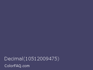 Decimal 10512009475 Color is a normal indigo color and the nearest color is Mulled Wine #4e4562. Hex code #444267 and RGB value is rgb(68,66,103). In RGB color space, this color is composed of 27% red, 26% green, 40% blue, In CMYK color space, this color is composed of 34% cyan, 36% magenta, 0% yellow , 60% black , In HSL color space, this color has a hue angle of 243° , 22% saturation and 33% lightness.