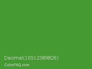 Decimal 10512589826 Color is a normal green color and the nearest color is May Green #4c9141. Hex code #459832 and RGB value is rgb(69,152,50). In RGB color space, this color is composed of 27% red, 60% green, 20% blue, In CMYK color space, this color is composed of 55% cyan, 0% magenta, 67% yellow , 40% black , In HSL color space, this color has a hue angle of 109° , 50% saturation and 40% lightness.