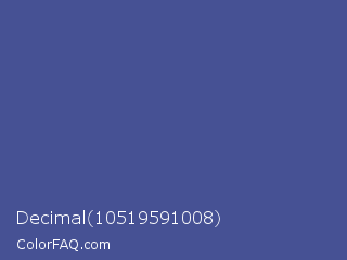 Decimal 10519591008 Color is a normal blue color and the nearest color is Victoria #534491. Hex code #465194 and RGB value is rgb(70,81,148). In RGB color space, this color is composed of 27% red, 32% green, 58% blue, In CMYK color space, this color is composed of 53% cyan, 45% magenta, 0% yellow , 42% black , In HSL color space, this color has a hue angle of 232° , 36% saturation and 43% lightness.