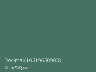 Decimal 10519650903 Color is a normal green color and the nearest color is Hookers Green #49796b. Hex code #467261 and RGB value is rgb(70,114,97). In RGB color space, this color is composed of 27% red, 45% green, 38% blue, In CMYK color space, this color is composed of 39% cyan, 0% magenta, 15% yellow , 55% black , In HSL color space, this color has a hue angle of 157° , 24% saturation and 36% lightness.