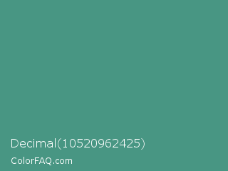 Decimal 10520962425 Color is a normal cyan color and the nearest color is Wintergreen Dream #56887d. Hex code #489683 and RGB value is rgb(72,150,131). In RGB color space, this color is composed of 28% red, 59% green, 51% blue, In CMYK color space, this color is composed of 52% cyan, 0% magenta, 13% yellow , 41% black , In HSL color space, this color has a hue angle of 165° , 35% saturation and 44% lightness.