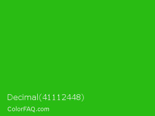 Decimal 41112448 Color is a normal green color and the nearest color is Harlequin Green #46cb18. Hex code #29bd14 and RGB value is rgb(41,189,20). In RGB color space, this color is composed of 16% red, 74% green, 8% blue, In CMYK color space, this color is composed of 78% cyan, 0% magenta, 89% yellow , 26% black , In HSL color space, this color has a hue angle of 113° , 81% saturation and 41% lightness.