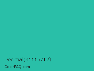 Decimal 41115712 Color is a normal cyan color and the nearest color is Light Sea Green #20b2aa. Hex code #29bfa8 and RGB value is rgb(41,191,168). In RGB color space, this color is composed of 16% red, 75% green, 66% blue, In CMYK color space, this color is composed of 79% cyan, 0% magenta, 12% yellow , 25% black , In HSL color space, this color has a hue angle of 171° , 65% saturation and 45% lightness.