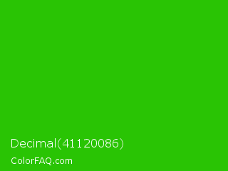 Decimal 41120086 Color is a normal green color and the nearest color is Harlequin Green #46cb18. Hex code #29c404 and RGB value is rgb(41,196,4). In RGB color space, this color is composed of 16% red, 77% green, 2% blue, In CMYK color space, this color is composed of 79% cyan, 0% magenta, 98% yellow , 23% black , In HSL color space, this color has a hue angle of 108° , 96% saturation and 39% lightness.