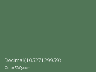 Decimal 10527129959 Color is a normal green color and the nearest color is Cactus #587156. Hex code #517657 and RGB value is rgb(81,118,87). In RGB color space, this color is composed of 32% red, 46% green, 34% blue, In CMYK color space, this color is composed of 31% cyan, 0% magenta, 26% yellow , 54% black , In HSL color space, this color has a hue angle of 130° , 19% saturation and 39% lightness.