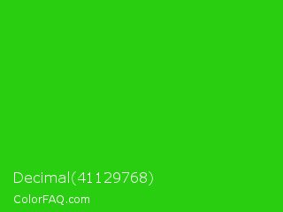 Decimal 41129768 Color is a normal green color and the nearest color is Harlequin Green #46cb18. Hex code #29ce10 and RGB value is rgb(41,206,16). In RGB color space, this color is composed of 16% red, 81% green, 6% blue, In CMYK color space, this color is composed of 80% cyan, 0% magenta, 92% yellow , 19% black , In HSL color space, this color has a hue angle of 112° , 86% saturation and 44% lightness.