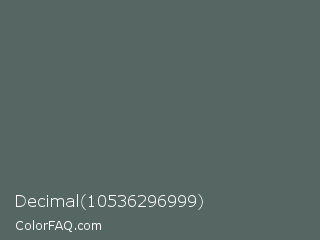 Decimal 10536296999 Color is a normal cyan color and the nearest color is Stormcloud #4f666a. Hex code #556663 and RGB value is rgb(85,102,99). In RGB color space, this color is composed of 33% red, 40% green, 39% blue, In CMYK color space, this color is composed of 17% cyan, 0% magenta, 3% yellow , 60% black , In HSL color space, this color has a hue angle of 169° , 9% saturation and 37% lightness.