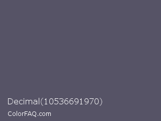 Decimal 10536691970 Color is a normal indigo color and the nearest color is Scarpa Flow #585562. Hex code #565366 and RGB value is rgb(86,83,102). In RGB color space, this color is composed of 34% red, 33% green, 40% blue, In CMYK color space, this color is composed of 16% cyan, 19% magenta, 0% yellow , 60% black , In HSL color space, this color has a hue angle of 249° , 10% saturation and 36% lightness.