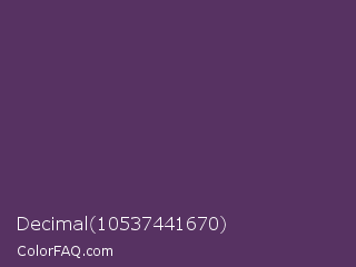 Decimal 10537441670 Color is a dark purple color and the nearest color is English Violet #563c5c. Hex code #573262 and RGB value is rgb(87,50,98). In RGB color space, this color is composed of 34% red, 20% green, 38% blue, In CMYK color space, this color is composed of 11% cyan, 49% magenta, 0% yellow , 62% black , In HSL color space, this color has a hue angle of 286° , 32% saturation and 29% lightness.