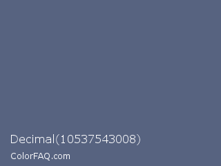 Decimal 10537543008 Color is a normal blue color and the nearest color is Paynes Grey #536878. Hex code #576380 and RGB value is rgb(87,99,128). In RGB color space, this color is composed of 34% red, 39% green, 50% blue, In CMYK color space, this color is composed of 32% cyan, 23% magenta, 0% yellow , 50% black , In HSL color space, this color has a hue angle of 222° , 19% saturation and 42% lightness.