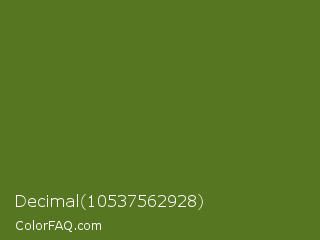 Decimal 10537562928 Color is a dark green color and the nearest color is Sap Green #507d2a. Hex code #577622 and RGB value is rgb(87,118,34). In RGB color space, this color is composed of 34% red, 46% green, 13% blue, In CMYK color space, this color is composed of 26% cyan, 0% magenta, 71% yellow , 54% black , In HSL color space, this color has a hue angle of 82° , 55% saturation and 30% lightness.