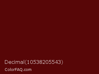 Decimal 10538205543 Color is a very dark red color and the nearest color is Mahogany #4e0606. Hex code #580607 and RGB value is rgb(88,6,7). In RGB color space, this color is composed of 35% red, 2% green, 3% blue, In CMYK color space, this color is composed of 0% cyan, 93% magenta, 92% yellow , 65% black , In HSL color space, this color has a hue angle of 359° , 87% saturation and 18% lightness.