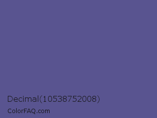 Decimal 10538752008 Color is a normal indigo color and the nearest color is Butterfly Bush #624e9a. Hex code #595490 and RGB value is rgb(89,84,144). In RGB color space, this color is composed of 35% red, 33% green, 56% blue, In CMYK color space, this color is composed of 38% cyan, 42% magenta, 0% yellow , 44% black , In HSL color space, this color has a hue angle of 245° , 26% saturation and 45% lightness.