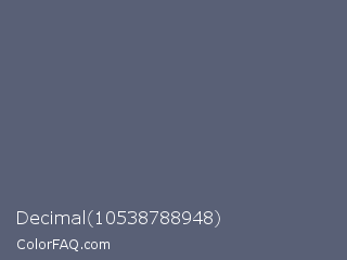 Decimal 10538788948 Color is a normal blue color and the nearest color is Comet #5c5d75. Hex code #596076 and RGB value is rgb(89,96,118). In RGB color space, this color is composed of 35% red, 38% green, 46% blue, In CMYK color space, this color is composed of 25% cyan, 19% magenta, 0% yellow , 54% black , In HSL color space, this color has a hue angle of 226° , 14% saturation and 41% lightness.