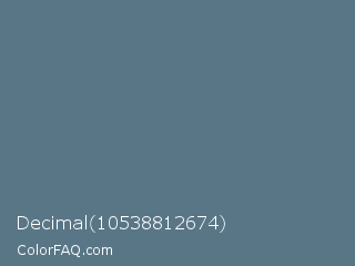 Decimal 10538812674 Color is a normal blue color and the nearest color is Smalt Blue #51808f. Hex code #597686 and RGB value is rgb(89,118,134). In RGB color space, this color is composed of 35% red, 46% green, 53% blue, In CMYK color space, this color is composed of 34% cyan, 12% magenta, 0% yellow , 47% black , In HSL color space, this color has a hue angle of 201° , 20% saturation and 44% lightness.