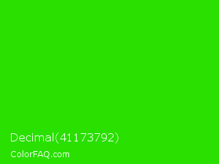 Decimal 41173792 Color is a normal green color and the nearest color is Harlequin #3fff00. Hex code #29e000 and RGB value is rgb(41,224,0). In RGB color space, this color is composed of 16% red, 88% green, 0% blue, In CMYK color space, this color is composed of 82% cyan, 0% magenta, 100% yellow , 12% black , In HSL color space, this color has a hue angle of 109° , 100% saturation and 44% lightness.
