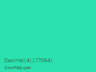 Decimal 41177094 Color is a normal green color and the nearest color is Eucalyptus #44d7a8. Hex code #29e2ae and RGB value is rgb(41,226,174). In RGB color space, this color is composed of 16% red, 89% green, 68% blue, In CMYK color space, this color is composed of 82% cyan, 0% magenta, 23% yellow , 11% black , In HSL color space, this color has a hue angle of 163° , 76% saturation and 52% lightness.