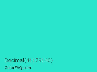 Decimal 41179140 Color is a normal cyan color and the nearest color is Turquoise PWG #30d5c8. Hex code #29e5cc and RGB value is rgb(41,229,204). In RGB color space, this color is composed of 16% red, 90% green, 80% blue, In CMYK color space, this color is composed of 82% cyan, 0% magenta, 11% yellow , 10% black , In HSL color space, this color has a hue angle of 172° , 78% saturation and 53% lightness.