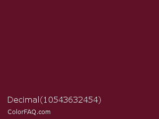Decimal 10543632454 Color is a very dark rose color and the nearest color is Black Rose #67032d. Hex code #601026 and RGB value is rgb(96,16,38). In RGB color space, this color is composed of 38% red, 6% green, 15% blue, In CMYK color space, this color is composed of 0% cyan, 83% magenta, 60% yellow , 62% black , In HSL color space, this color has a hue angle of 344° , 71% saturation and 22% lightness.