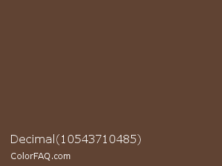 Decimal 10543710485 Color is a dark orange color and the nearest color is Millbrook #594433. Hex code #604333 and RGB value is rgb(96,67,51). In RGB color space, this color is composed of 38% red, 26% green, 20% blue, In CMYK color space, this color is composed of 0% cyan, 30% magenta, 47% yellow , 62% black , In HSL color space, this color has a hue angle of 21° , 31% saturation and 29% lightness.