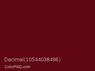 Decimal 10544038496 Color is a very dark red color and the nearest color is Dark Tan #661010. Hex code #610714 and RGB value is rgb(97,7,20). In RGB color space, this color is composed of 38% red, 3% green, 8% blue, In CMYK color space, this color is composed of 0% cyan, 93% magenta, 79% yellow , 62% black , In HSL color space, this color has a hue angle of 351° , 87% saturation and 20% lightness.