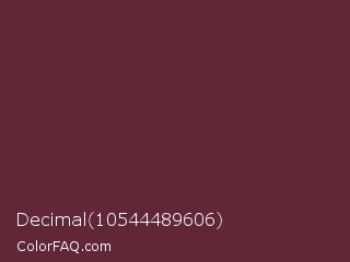 Decimal 10544489606 Color is a dark rose color and the nearest color is Buccaneer #622f30. Hex code #612736 and RGB value is rgb(97,39,54). In RGB color space, this color is composed of 38% red, 15% green, 21% blue, In CMYK color space, this color is composed of 0% cyan, 60% magenta, 44% yellow , 62% black , In HSL color space, this color has a hue angle of 344° , 43% saturation and 27% lightness.